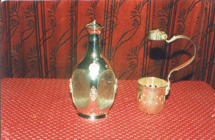 These White Metal Decanters (left) are crested and engraved. They are very brunished and attractive.We have provided hinges for the bottle to be changed.