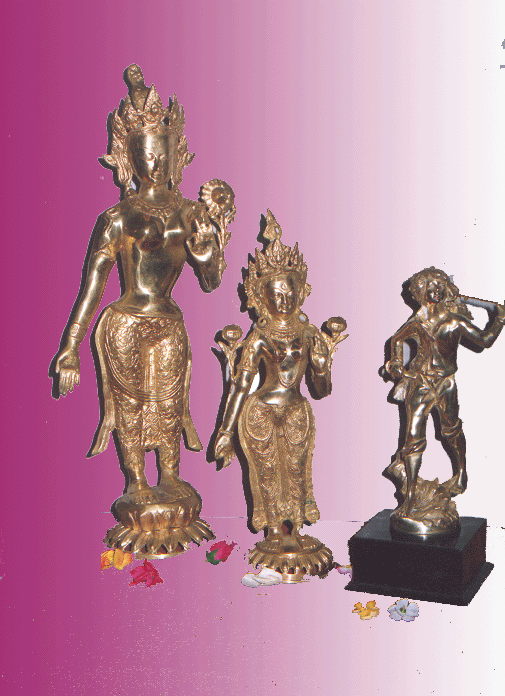 Other statues are also available in solid Brass (golden). Tara Sratues (left) are available in various sizes ranging from 30cm in height to 90cm in height. The brass boy statue is 30cm in height. All such statues can be mounted on an optional wooden base that needs to be ordered seperately. The wooden base can contain a brass (yellow) or a white metal (white) plate that may be engraved, if in case the statue is to be used as a presentation gift. |